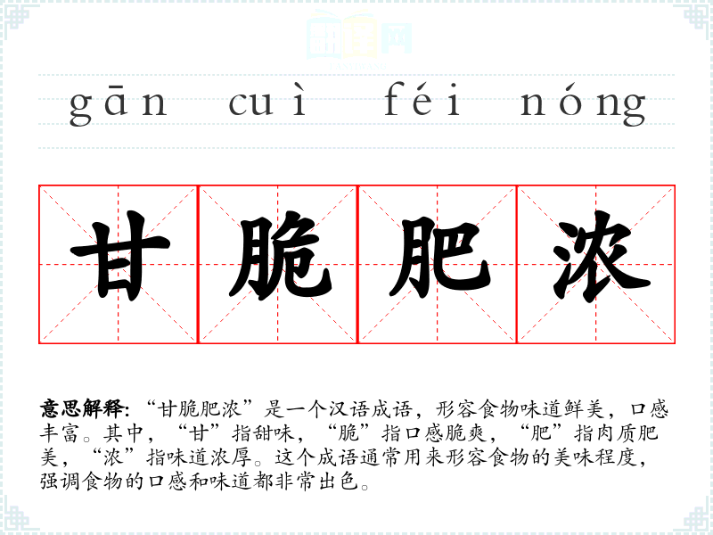 “甘脆肥浓”是一个汉语成语,形容食物味道鲜美,口感丰富。其中,“甘”指甜味,“脆”指口感脆爽,“肥”指肉质肥美,“浓”指味道浓厚。这个成语通常用来形容食物的美味程度,强调食物的口感和味道都非常出色。