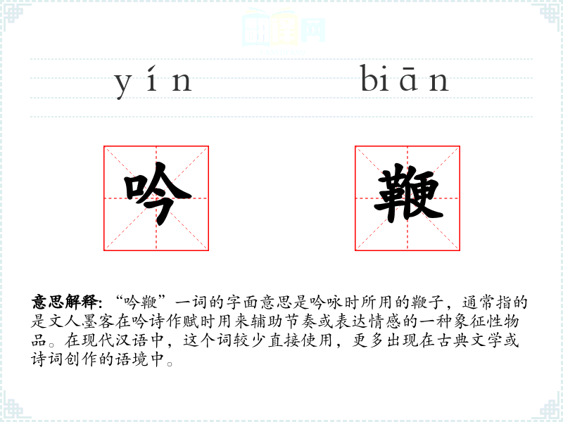 “吟鞭”一词的字面意思是吟咏时所用的鞭子,通常指的是文人墨客在吟诗作赋时用来辅助节奏或表达情感的一种象征性物品。在现代汉语中,这个词较少直接使用,更多出现在古典文学或诗词创作的语境中。