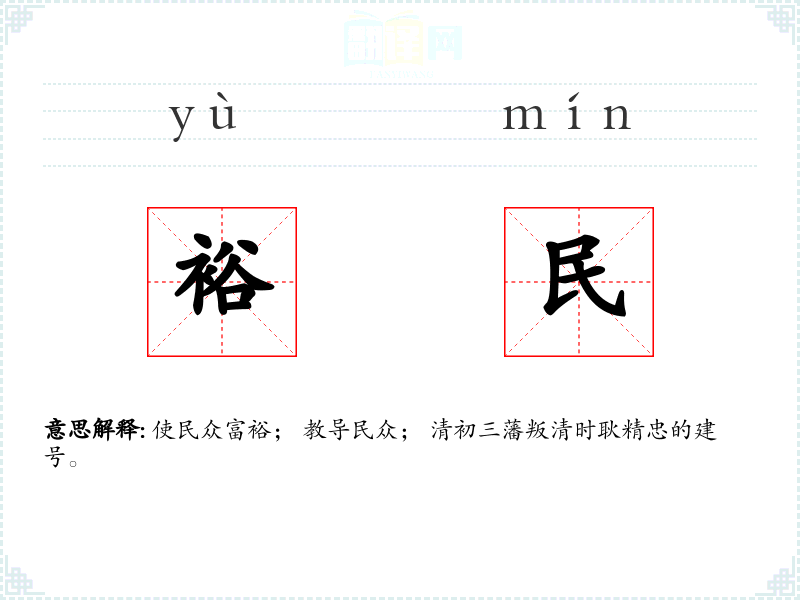 使民众富裕; 教导民众; 清初三藩叛清时耿精忠的建号。