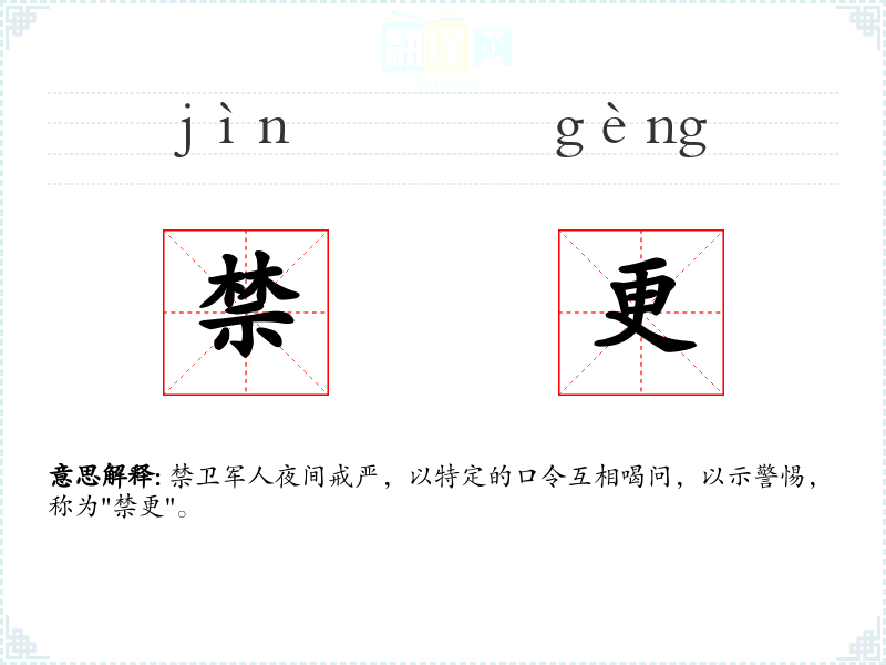 禁卫军人夜间戒严,以特定的口令互相喝问,以示警惕,称为"禁更"。