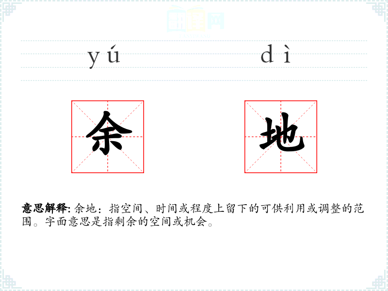 余地:指空间、时间或程度上留下的可供利用或调整的范围。字面意思是指剩余的空间或机会。