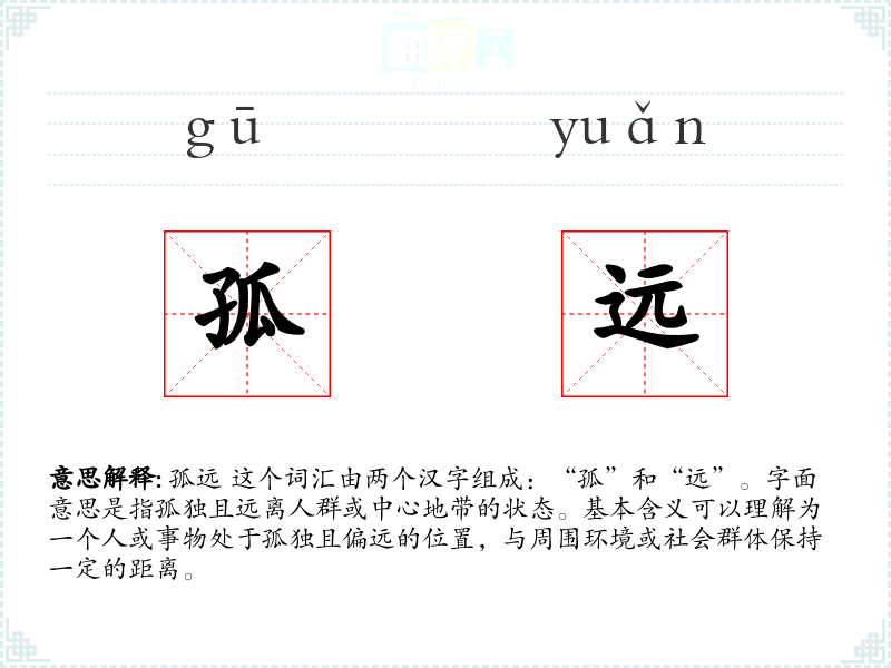 孤远 这个词汇由两个汉字组成:“孤”和“远”。字面意思是指孤独且远离人群或中心地带的状态。基本含义可以理解为一个人或事物处于孤独且偏远的位置,与周围环境或社会群体保持一定的距离。