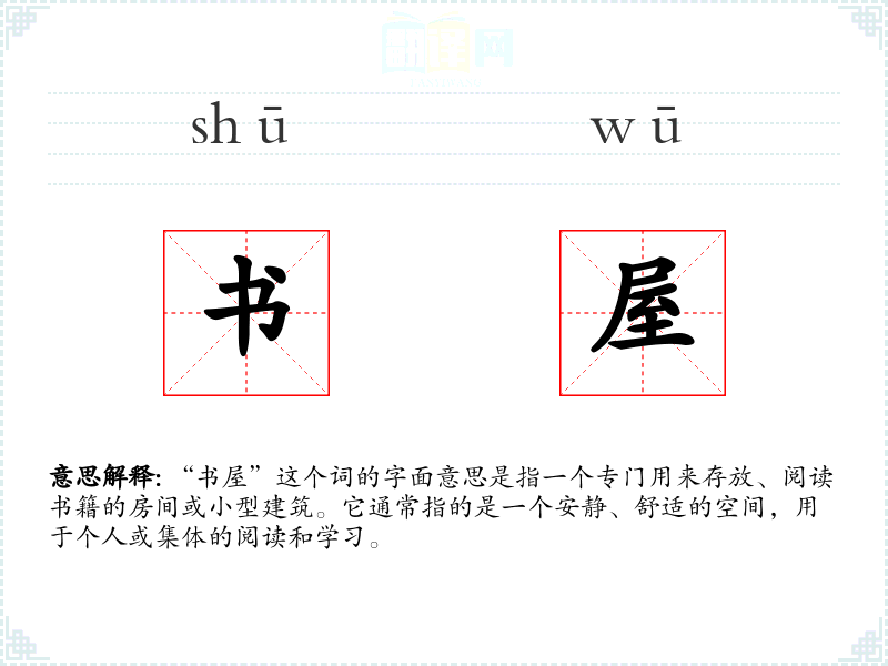 “书屋”这个词的字面意思是指一个专门用来存放、阅读书籍的房间或小型建筑。它通常指的是一个安静、舒适的空间,用于个人或集体的阅读和学*。