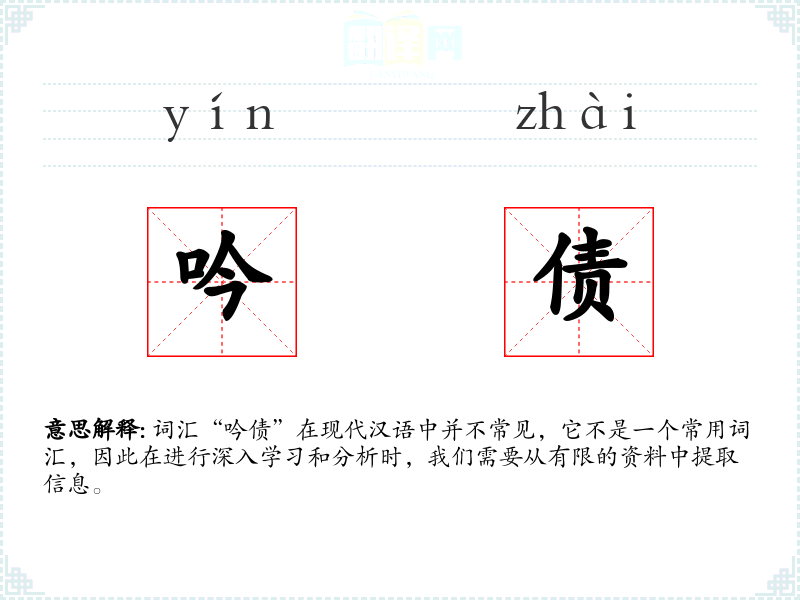 词汇“吟债”在现代汉语中并不常见,它不是一个常用词汇,因此在进行深入学*和分析时,我们需要从有限的资料中提取信息。