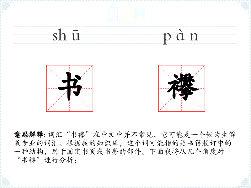 词汇“书襻”在中文中并不常见,它可能是一个较为生僻或专业的词汇。根据我的知识库,这个词可能指的是书籍装订中的一种结构,用于固定书页或书脊的部件。下面我将从几个角度对“书襻”进行分析: