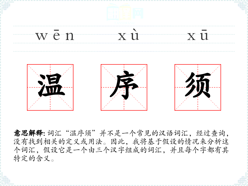 词汇“温序须”并不是一个常见的汉语词汇,经过查询,没有找到相关的定义或用法。因此,我将基于假设的情况来分析这个词汇,假设它是一个由三个汉字组成的词汇,并且每个字都有其特定的含义。