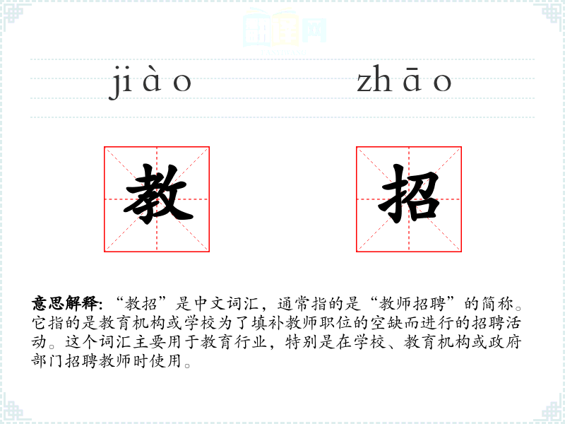 “教招”是中文词汇,通常指的是“教师招聘”的简称。它指的是教育机构或学校为了填补教师职位的空缺而进行的招聘活动。这个词汇主要用于教育行业,特别是在学校、教育机构或政府部门招聘教师时使用。