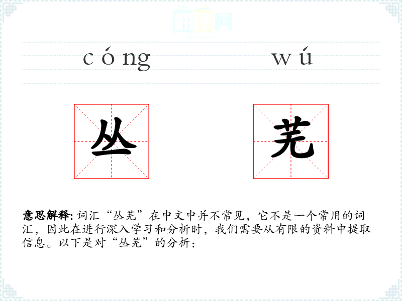 词汇“丛芜”在中文中并不常见,它不是一个常用的词汇,因此在进行深入学习和分析时,我们需要从有限的资料中提取信息。以下是对“丛芜”的分析: