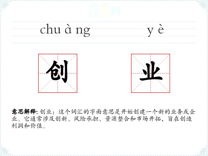创业:这个词汇的字面意思是开始创建一个新的业务或企业。它通常涉及创新、风险承担、资源整合和市场开拓,旨在创造利润和价值。
