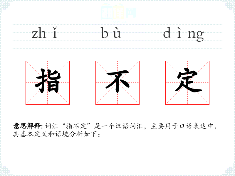 - 口语:在日常对话中,人们常用“指不定”来表达对未来**的不确定性,例如:“他指不定什么时候回来。”