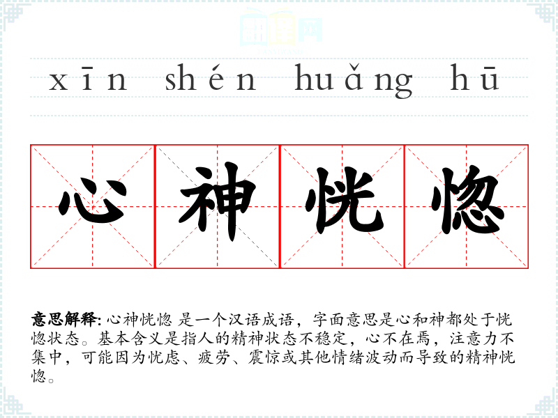 心神恍惚 是一个汉语成语,字面意思是心和神都处于恍惚状态。基本含义是指人的精神状态不稳定,心不在焉,注意力不集中,可能因为忧虑、疲劳、震惊或其他情绪波动而导致的精神恍惚。