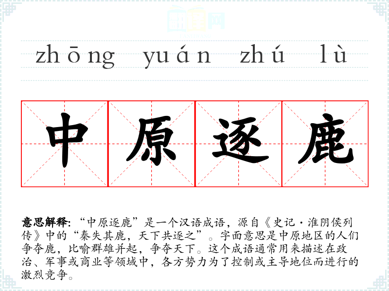“中原逐鹿”是一个汉语成语,源自《史记·淮阴侯列传》中的“秦失其鹿,天下共逐之”。字面意思是中原地区的人们争夺鹿,比喻群雄并起,争夺天下。这个成语通常用来描述在政治、军事或商业等领域中,各方势力为了控制或主导地位而进行的激烈竞争。