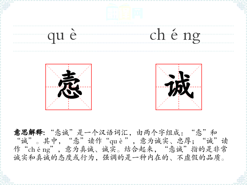 “悫诚”是一个汉语词汇,由两个字组成:“悫”和“诚”。其中,“悫”读作“què”,意为诚实、忠厚;“诚”读作“chéng”,意为真诚、诚实。结合起来,“悫诚”指的是非常诚实和真诚的态度或行为,强调的是一种内在的、不虚假的品质。