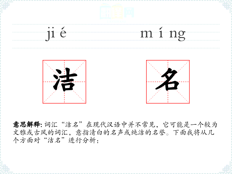 “洁名”字面意思是指清洁、无瑕疵的名声。它强调的是一个人或事物在社会中的声誉是正直、无污点的。