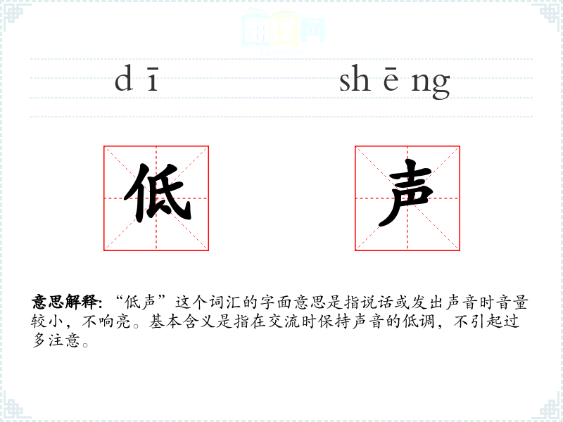 “低声”这个词源于汉语,由“低”和“声”两个字组成。在古代汉语中,“低”指的是位置或程度上的低下,“声”指的是声音。随着语言的发展,“低声”逐渐被用来描述声音的音量小。