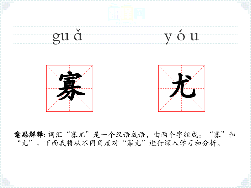词汇“寡尤”是一个汉语成语,由两个字组成:“寡”和“尤”。下面我将从不同角度对“寡尤”进行深入学*和分析。