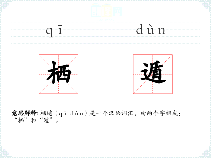 栖遁(qī dùn)是一个汉语词汇,由两个字组成:“栖”和“遁”。