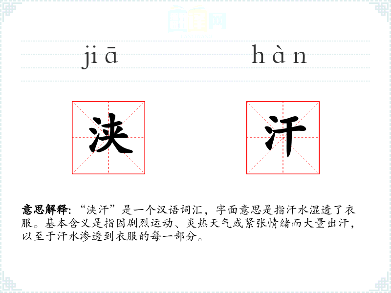 “浃”字古汉语中意为渗透、湿透,而“汗”自然是指汗水。这个词汇在古代文献中已有使用,如《左传》中有“汗浃背”的描述,现代汉语中保留了这一表达,但使用频率相对较低。