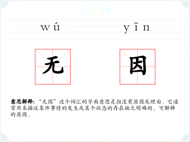 “无因”这个词汇的字面意思是指没有原因或理由。它通常用来描述某件事情的发生或某个状态的存在缺乏明确的、可解释的原因。