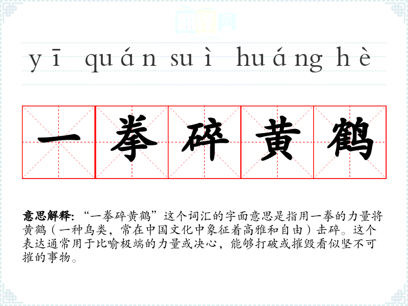 “一拳碎黄鹤”这个词汇的字面意思是指用一拳的力量将黄鹤(一种鸟类,常在**文化中象征着高雅和自由)击碎。这个表达通常用于比喻极端的力量或决心,能够打破或摧毁看似坚不可摧的事物。