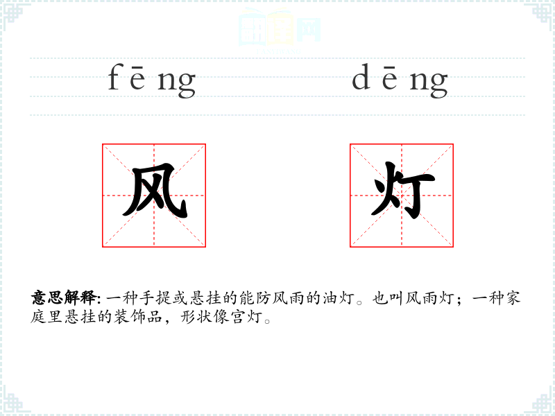 一种手提或悬挂的能防风雨的油灯。也叫风雨灯;一种家庭里悬挂的装饰品,形状像宫灯。