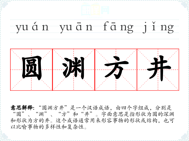 “圆渊方井”这个成语不仅描述了具体的形状,还蕴含了丰富的文化意义和美学价值。在语言学*和表达中,理解和运用这样的成语可以丰富我们的词汇量,提升语言的表达能力。