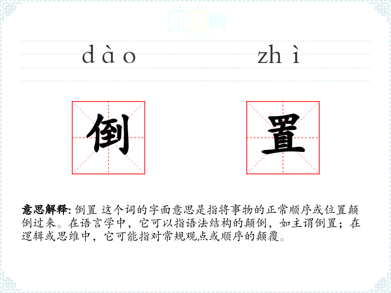 倒置 这个词的字面意思是指将事物的正常顺序或位置颠倒过来。在语言学中,它可以指语法结构的颠倒,如主谓倒置;在逻辑或思维中,它可能指对常规观点或顺序的颠覆。