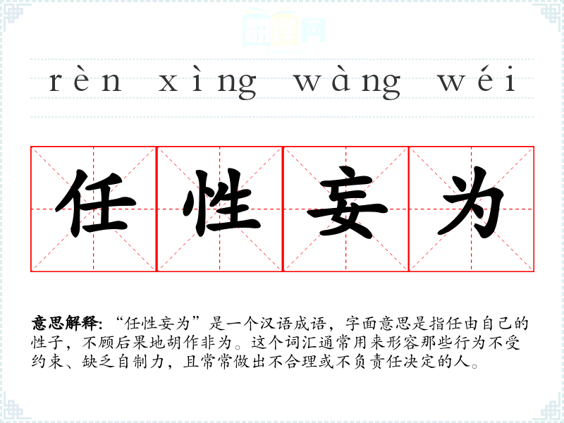 “任性妄为”是一个汉语成语,字面意思是指任由自己的性子,不顾后果地****。这个词汇通常用来形容那些行为不受约束、缺乏自制力,且常常做出不合理或不负责任决定的人。
