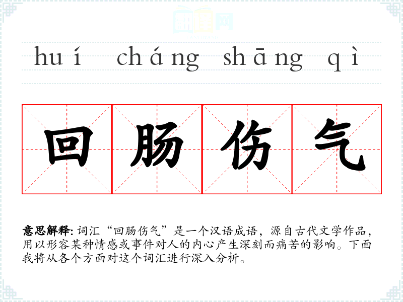 词汇“回肠伤气”是一个汉语成语,源自古代文学作品,用以形容某种情感或**对人的内心产生深刻而痛苦的影响。下面我将从各个方面对这个词汇进行深入分析。