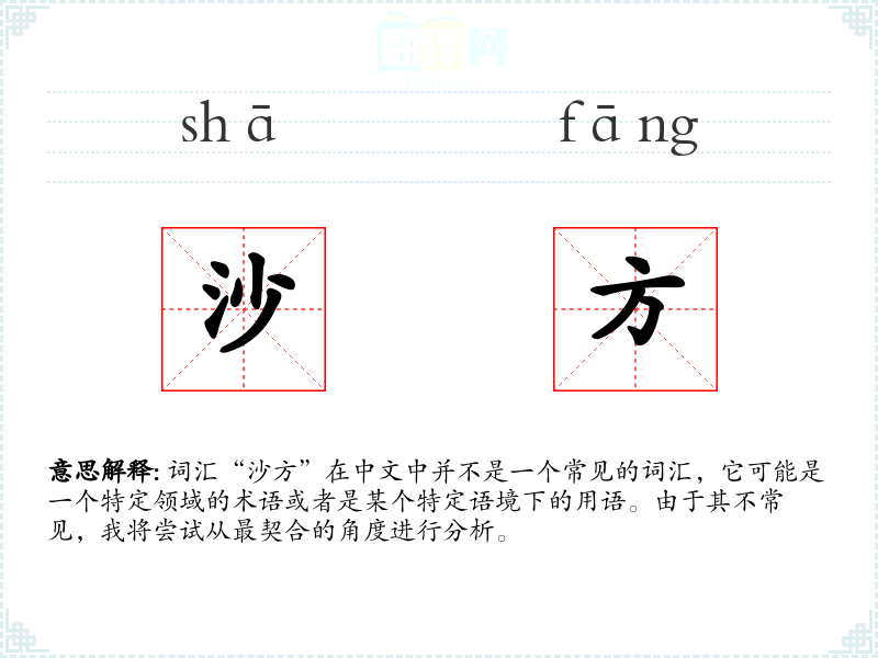 词汇“沙方”在中文中并不是一个常见的词汇,它可能是一个特定领域的术语或者是某个特定语境下的用语。由于其不常见,我将尝试从最契合的角度进行分析。