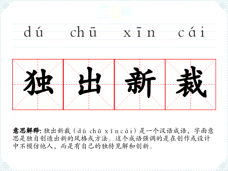 独出新裁(dú chū xīn cái)是一个汉语成语,字面意思是独自创造出新的风格或方法。这个成语强调的是在创作或设计中不模仿他人,而是有自己的独特见解和创新。