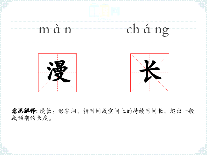 - 词源:“漫长”由“漫”和“长”两个字组成。“漫”原指水流无边际,引申为无限制、无边际;“长”指时间或空间上的延伸。