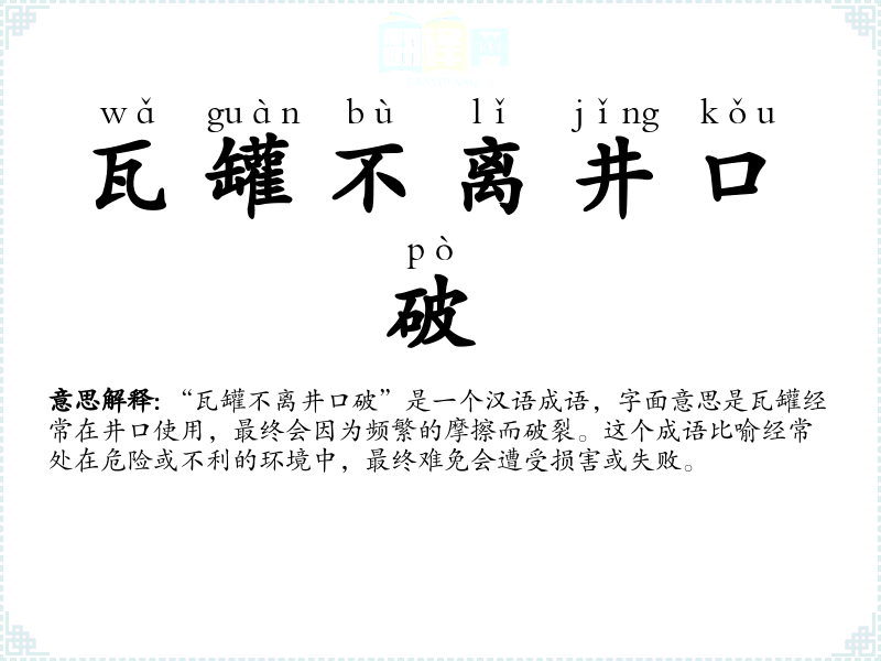 “瓦罐不离井口破”是一个汉语成语,字面意思是瓦罐经常在井口使用,最终会因为频繁的摩擦而破裂。这个成语比喻经常处在危险或不利的环境中,最终难免会遭受损害或失败。