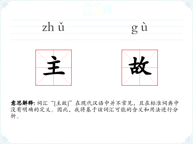 由于“[主故]”不是一个标准词汇,我们无法提供确切的基本定义。如果将其拆分为“主”和“故”两个字,可以有以下解释: