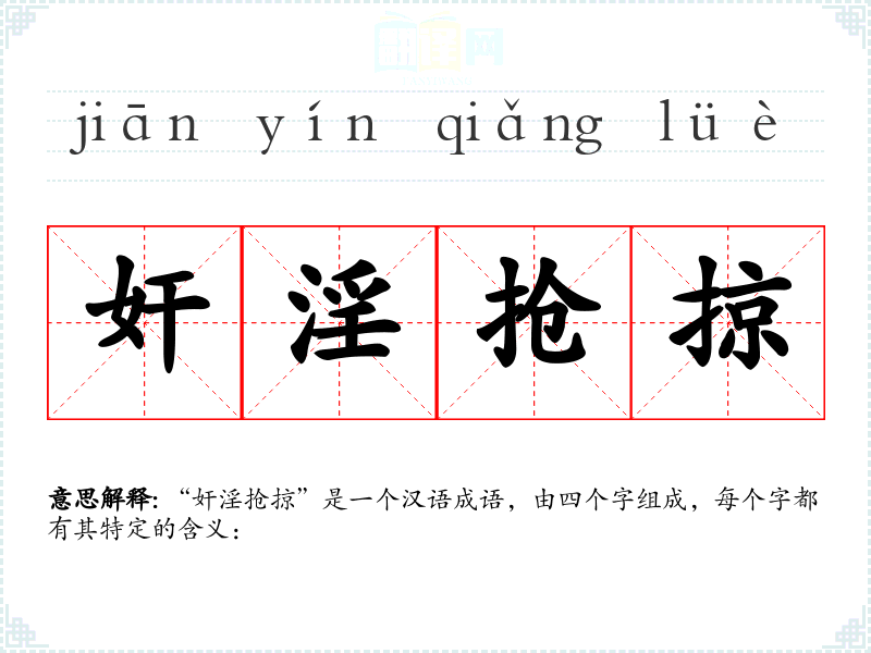 “奸淫抢掠”是一个汉语成语,由四个字组成,每个字都有其特定的含义: