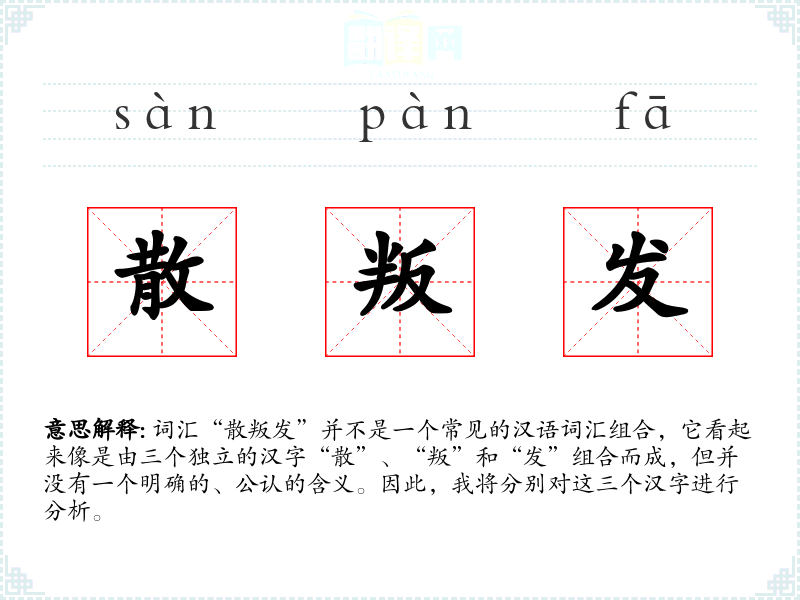 词汇“散叛发”并不是一个常见的汉语词汇组合,它看起来像是由三个独立的汉字“散”、“叛”和“发”组合而成,但并没有一个明确的、公认的含义。因此,我将分别对这三个汉字进行分析。