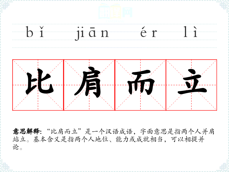 “比肩而立”是一个汉语成语,字面意思是指两个人并肩站立。基本含义是指两个人地位、能力或成就相当,可以相提并论。