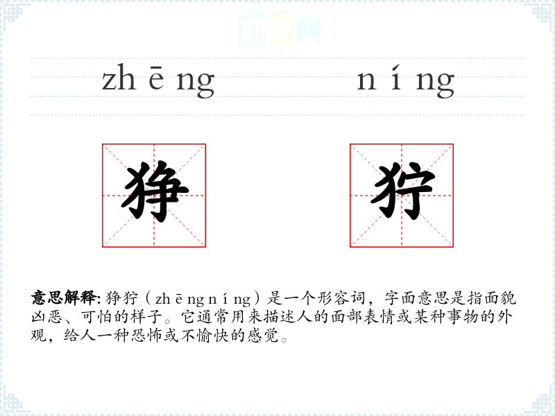 狰狞(zhēng níng)是一个形容词,字面意思是指面貌凶恶、可怕的样子。它通常用来描述人的面部表情或某种事物的外观,给人一种恐怖或不愉快的感觉。