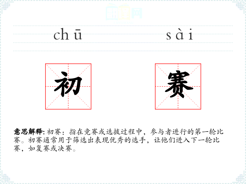 初赛一词由“初”和“赛”组成。“初”表示开始或第一,“赛”表示比赛。这个词在中文中直接表达了其含义,没有复杂的词源或演变过程。