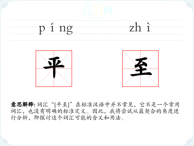 词汇“[平至]”在标准汉语中并不常见,它不是一个常用词汇,也没有明确的标准定义。因此,我将尝试从最契合的角度进行分析,即探讨这个词汇可能的含义和用法。