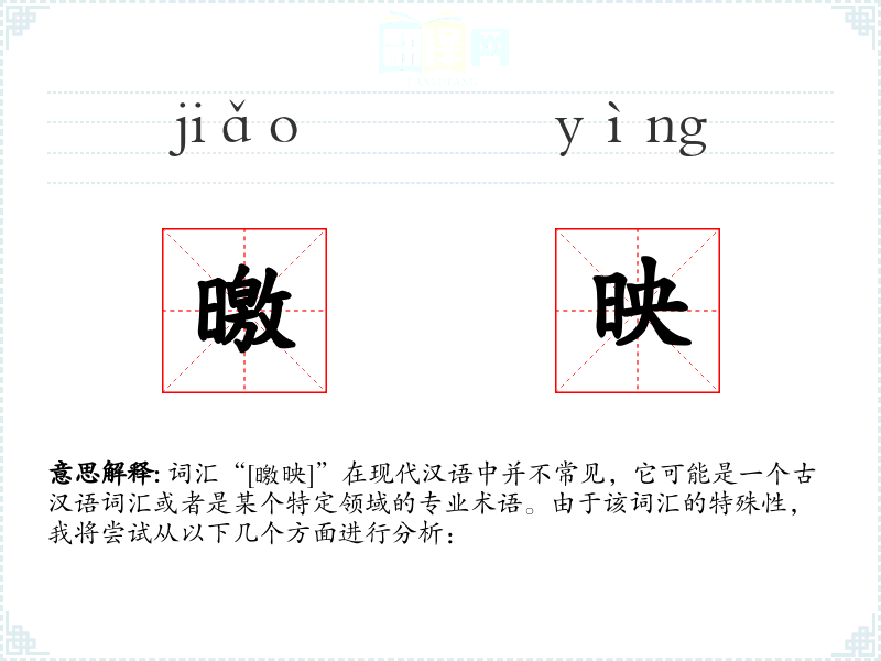 由于“曒映”不是一个常用词汇,其词源和演变可能与古汉语中的“曒”和“映”有关。在古代文献中,“曒”常用来形容明亮,而“映”则表示反射。