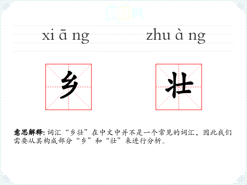 词汇“乡壮”在中文中并不是一个常见的词汇,因此我们需要从其构成部分“乡”和“壮”来进行分析。