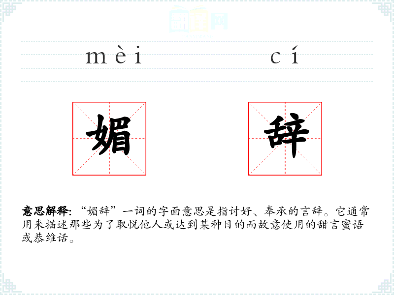 “媚辞”一词的字面意思是指讨好、奉承的言辞。它通常用来描述那些为了取悦他人或达到某种目的而故意使用的甜言蜜语或恭维话。