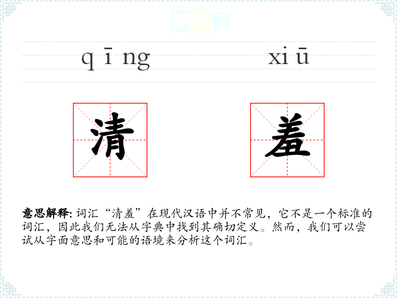 词汇“清羞”在现代汉语中并不常见,它不是一个标准的词汇,因此我们无法从字典中找到其确切定义。然而,我们可以尝试从字面意思和可能的语境来分析这个词汇。