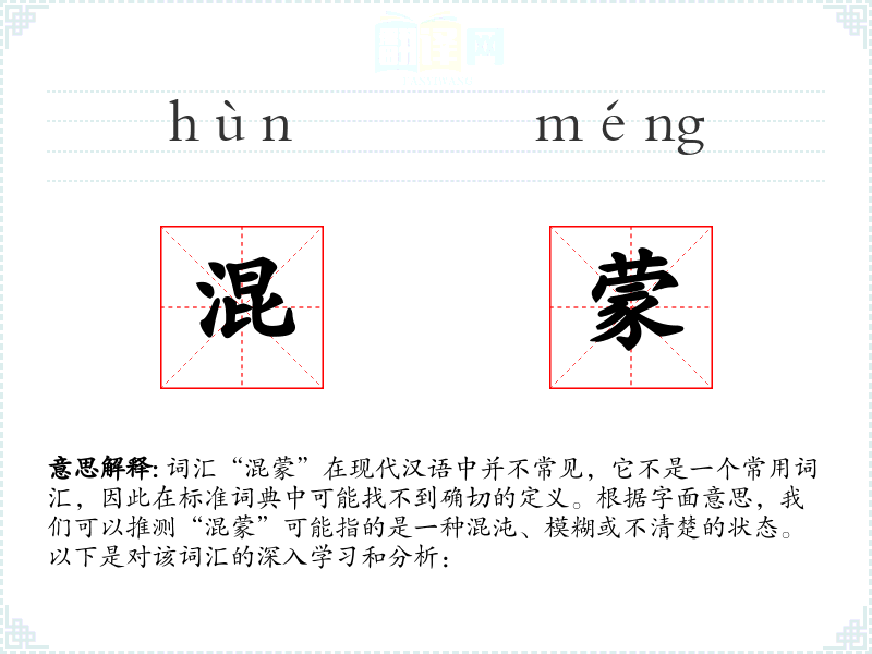 - “混蒙”是一个描述模糊、混乱状态的词汇,虽然在日常语言中不常用,但在文学和特定语境中可能有所应用。了解这个词汇有助于丰富语言表达的多样性。