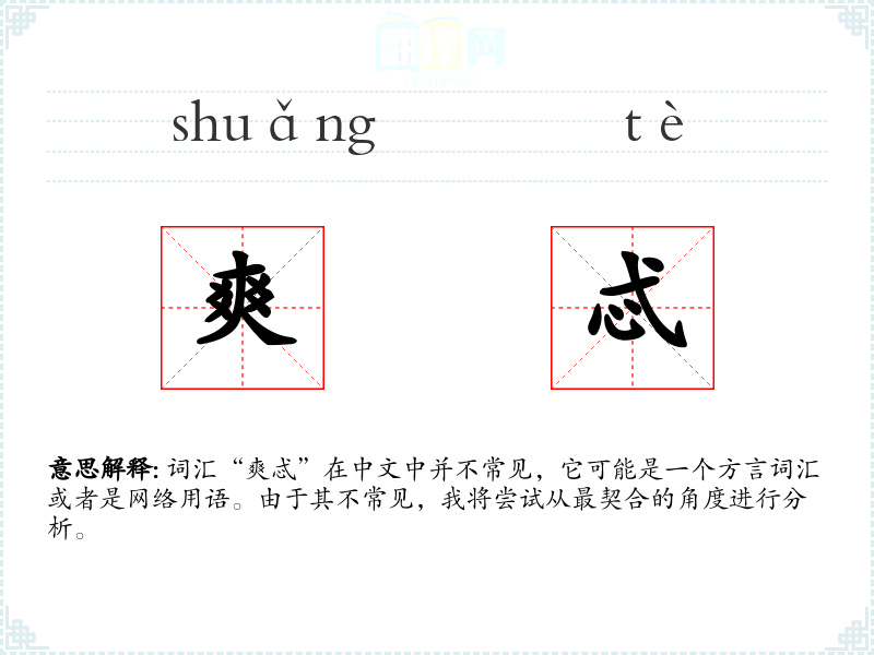 词汇“爽忒”在中文中并不常见,它可能是一个方言词汇或者是网络用语。由于其不常见,我将尝试从最契合的角度进行分析。