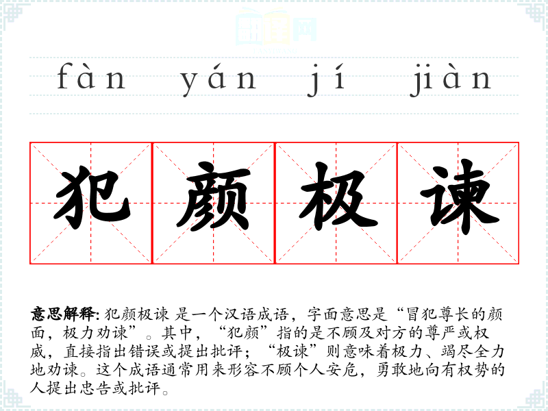 犯颜极谏 是一个汉语成语,字面意思是“冒犯尊长的颜面,极力劝谏”。其中,“犯颜”指的是不顾及对方的尊严或权威,直接指出错误或提出批评;“极谏”则意味着极力、竭尽全力地劝谏。这个成语通常用来形容不顾个人安危,勇敢地向有权势的人提出忠告或批评。