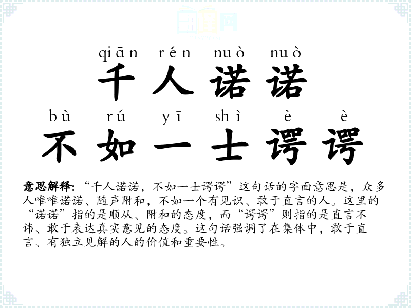 “千人诺诺,不如一士谔谔”这句话的字面意思是,众多人唯唯诺诺、随声附和,不如一个有见识、敢于直言的人。这里的“诺诺”指的是顺从、附和的态度,而“谔谔”则指的是直言不讳、敢于表达真实意见的态度。这句话强调了在集体中,敢于直言、有独立见解的人的价值和重要性。