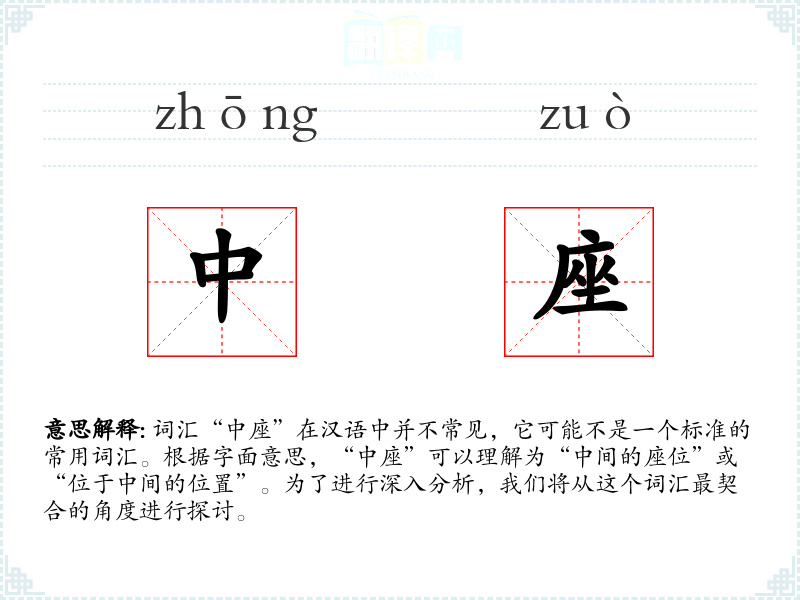 词汇“中座”在汉语中并不常见,它可能不是一个标准的常用词汇。根据字面意思,“中座”可以理解为“中间的座位”或“位于中间的位置”。为了进行深入分析,我们将从这个词汇最契合的角度进行探讨。