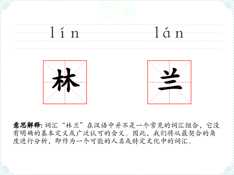 由于“林兰”不是一个标准词汇,我们可以假设它可能是一个人名,其中“林”通常指树木丛生的地方,而“兰”可以指兰花,一种常见的花卉,象征着高雅和纯洁。